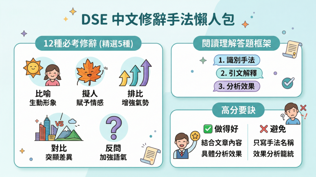 修辭手法是DSE中文科的核心考點之一,無論是閱讀理解(卷一)還是寫作(卷二)都必然涉及。